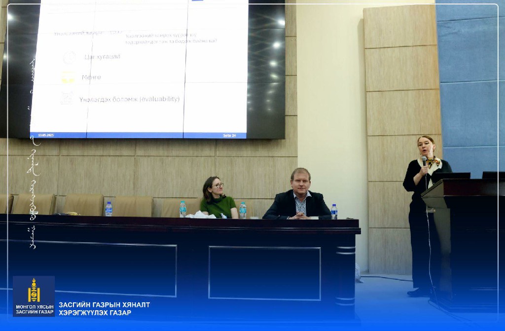 Монгол Улсад хөгжлийн бодлогын үнэлгээний чадавхыг сайжруулах хүрээнд 2025 оны 5 дугаар сарын 13-ны өдөр зохион байгуулсан “Хөгжлийн бодлогын үнэлгээ” сургалтад Засгийн газрын Хяналт хэрэгжүүлэх газрын албан хаагчид оролцлоо. Тус сургалтыг Холбооны Бүгд Найрамдах Герман Улсын Хөгжлийн үнэлгээний институтийн дэд захирал ноён Свен Хартен, үнэлгээний багийн ахлагч хатагтай Сара Дезири, үнэлгээчин хатагтай Сабине Пальмройтер нар удирдаж явууллаа. Сургалтын үеэр албан хаагчдад байгууллагын үйл ажиллагаа болон бодлогын үнэлгээний зорилго, үндсэн үүрэг, ач холбогдол, мониторинг болон үнэлгээний ялгаа, холбоо, хамаарал, үнэлгээний төрөл, үнэлгээний стандарт зэрэг олон асуудлын хүрээнд тодорхой ойлголт, мэдээллийг өгч, кейс сургалтыг бодлогын улсын үнэлгээг хөгжүүлэхэд дэмжлэг болох сонирхолтой асуудлаар зохион байгуулсан байна.