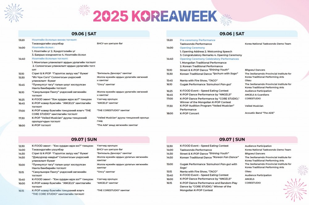 Нийслэлийн Аялал жуулчлалын газар БНСУ-аас Монгол Улсад суугаа Элчин сайдын яамтай хамтран 2025 оны 9 дүгээр сарын 6,7-ны өдрүүдэд Жанжин Д.Сүхбаатарын талбайд “Солонгосын соёл, аялал жуулчлалын өдрүүд-2025” арга хэмжээг зохион байгуулах гэж байна.