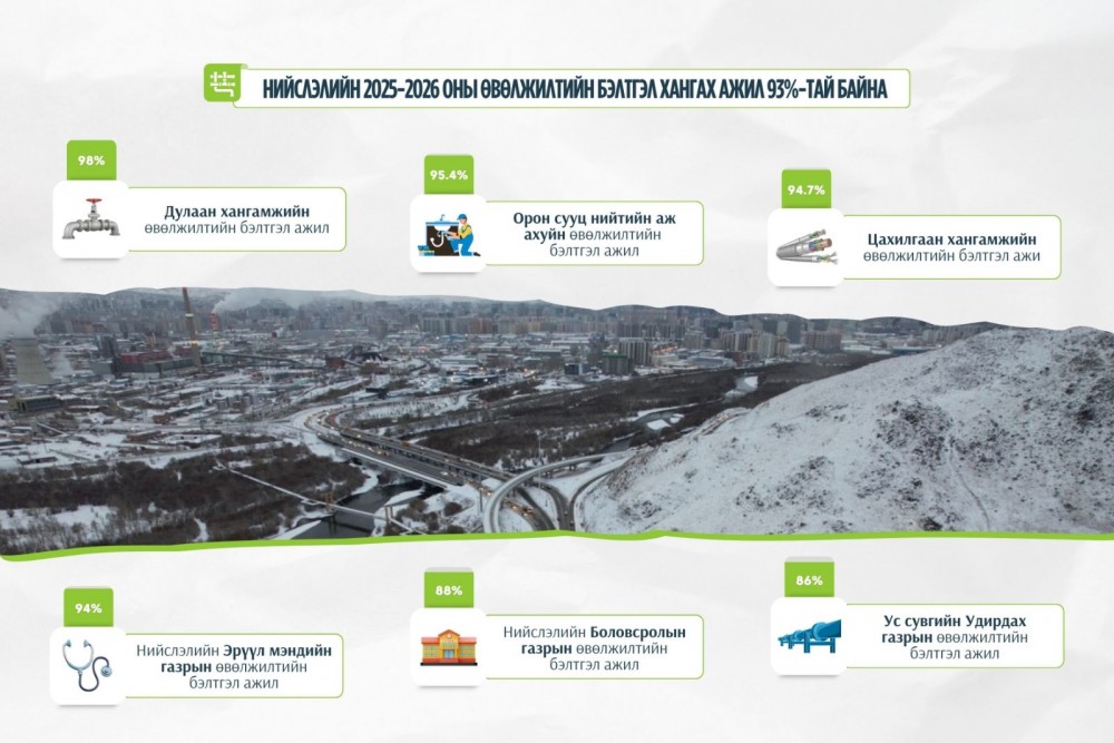 Нийслэлийн 2025-2026 оны өвөлжилтийн бэлтгэл ажлыг хангах зорилгоор энэ оны нэгдүгээр сараас эхлэн нэгдсэн төлөвлөгөө гарган, шат дараалсан арга хэмжээнүүдийг авч хэрэгжүүлж байна. Уг төлөвлөгөөнд инженерийн дэд бүтэц, авто зам, тохижилт, бүтээн байгуулалт зэрэг нийт 750 төсөл арга хэмжээ тусгагдсан бөгөөд өнөөдрийн байдлаар өвөлжилтийн бэлтгэл ажил 93 хувийн гүйцэтгэлтэй үргэлжилж байна. Тухайлбал,