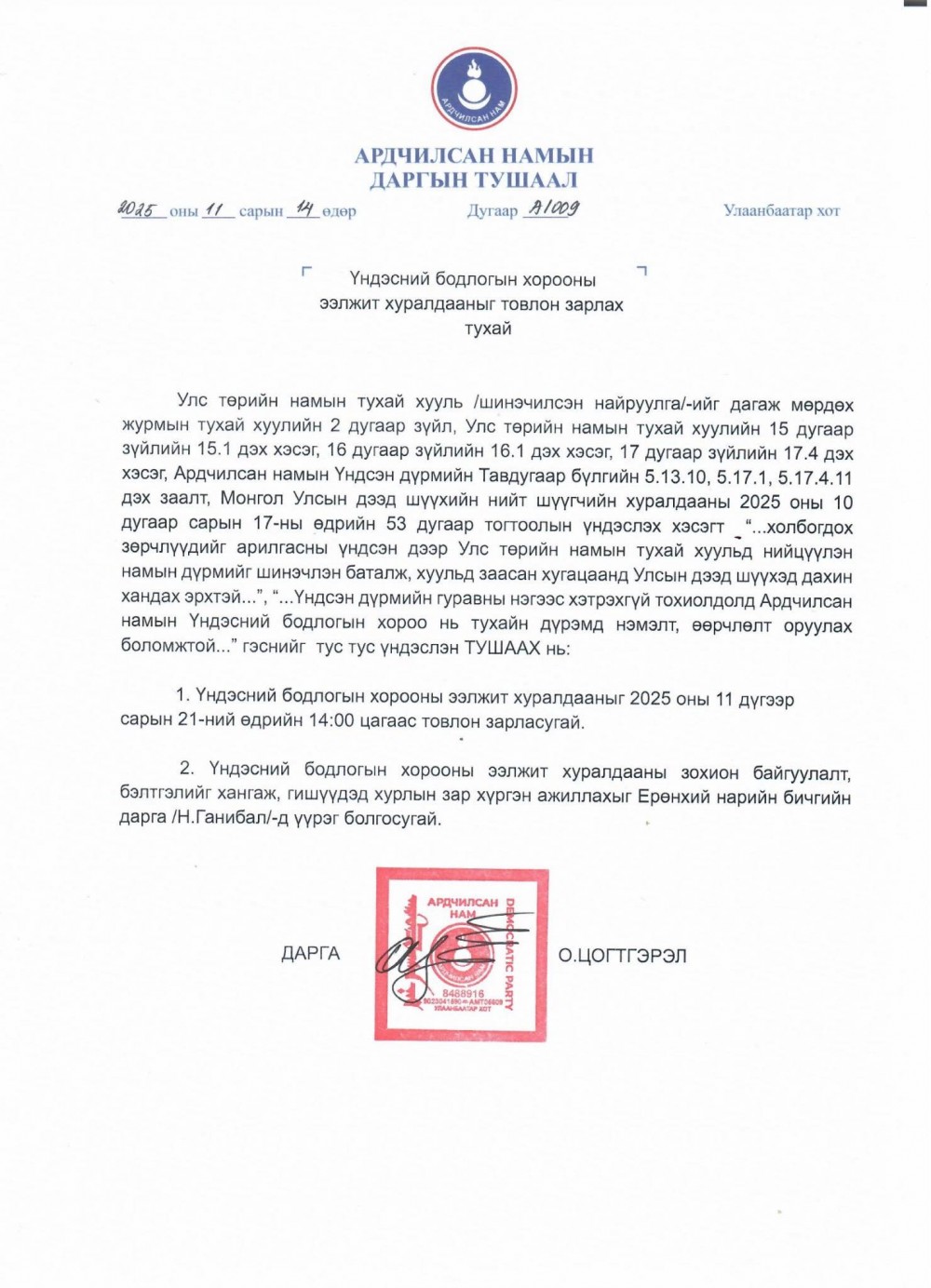 Улс төрийн намын тухай хуулийн шинэчилсэн найруулгаар улс төрийн намууд энэ онд багтаж намын Үндсэн дүрэм, хөтөлбөрийн төслөө Улсын дээд шүүхэд бүртгүүлэх үүрэг хүлээсэн. Энэ дагуу Ардчилсан намаас Үндсэн дүрмийн шинэчилсэн найруулгын төслийг боловсруулж 2025 оны наймдугаар сарын 31-ний өдрийн намын Их хурлаар хэлэлцүүлэн баталж Улсын дээд шүүхэд бүртгүүлэхээр хүргүүлсэн. Гэвч Үндсэн дүрмийн тодорхой зарим заалт хуульд нийцэхгүй байгаа үндэслэлээр Улсын дээд шүүхээс бүртгэлгүй буцаасан. Иймд Ардчилсан намын даргын зүгээс Үндсэн дүрмийн уг заалтыг хуульд нийцүүлэн дахин боловсруулах чиг үүрэг бүхий Ажлын хэсэг байгуулан ажиллуулснаар дүрмийн төслийг Үзэл баримтлал, үндсэн дүрмийн хороогоор хэлэлцүүлж, улмаар 2025 оны 11 дүгээр сарын 21-ний өдөр ҮБХ-ны ээлжит хуралдааныг хуралдуулж дүрмээ батлахаар тов зарлалаа.